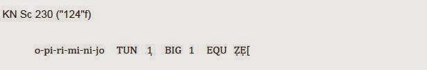 • Esta transcripción sólo tiene una línea: no hay signos en ella que nos hagan pensar que el texto de la tablilla está escrito en más de una línea. Recordad que la primera línea de arriba corresponde al «nombre» de la tablilla que se le ha dado como ya os expliqué.