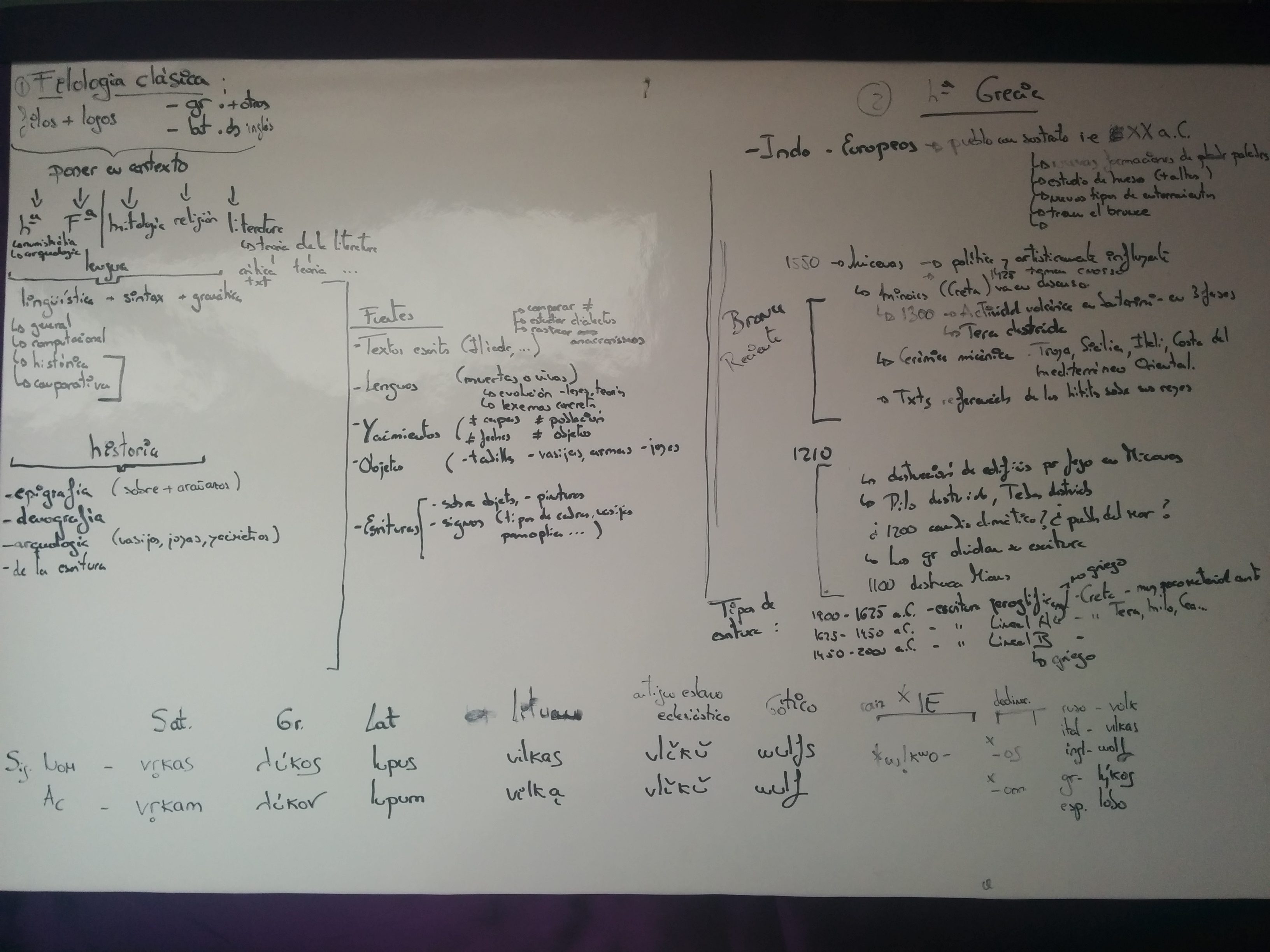 Vale, se ve horrible. Pero explica de una forma resumida lo que es la filología, las épocas y los campos en los que estoy especializada, qué fuentes de conocimiento existen para lenguas que ya no se hablan, tipos de escritura y dónde está la micénica… Y la apoteosis: al final reconstruimos de una forma un poco «básica» desde el Indo-Europeo para relacionar con algo «moderno». Con eso alucinan todos, porque ahí se ve claramente la dificultad. De tener poco o casi nada, y hacer algo con ello, ya sea en literatura, arqueología, lingüística… Que no me digan que eso no es una ciencia. ¡Es casi un arte!.