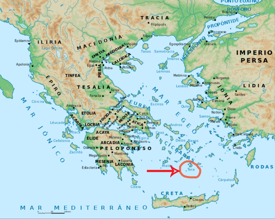 Esto habría que multiplicarlo en el caso de Tera por cuatro, pues es cuatro veces mayor el área del cráter de su volcán y de 390 metros de profundidad frente a los 250 del Krakatoa. Las consecuencias serían más o menos imaginables. Al parecer, Tera entonces, la Santorini de hoy formada por dos islas, Tera y Terasia, era una sola isla llamada Redonda, que debió quedar dividida tras la erupción.